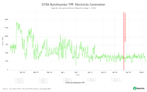 The DTEK Burshtynska TPP, whose energy goes mainly for export, is a whole different story: here, generation nosedived starting mid-March. As of mid-April, it was running at 400 MW, against the earlier maximum of 1,400 MW.