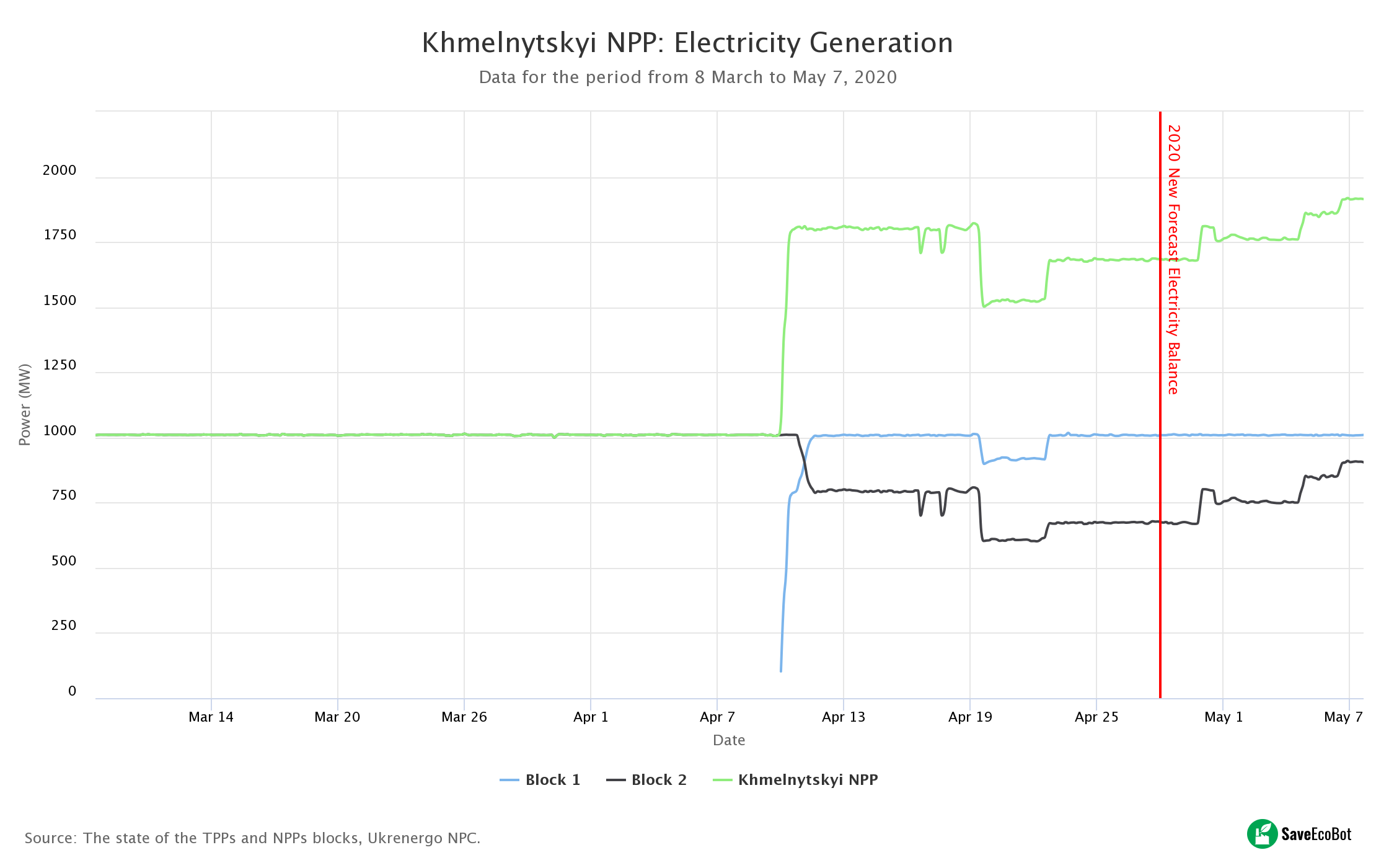 Indeed, Khmelnytskyi NPP ramped up generation on 10 April, launching its 1,000-MW unit No. 1 and cutting the output of unit No.2 to 800 MW. Consequently, the facility’s total output grew by about 750 MW.