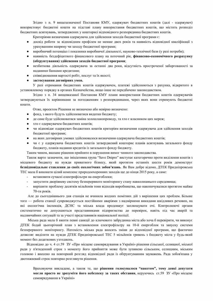 На жаль, Дніпровська міська рада майже одноголосно підтримала виділення 5 мільйонів з міського бюджету для ДТЕК в межах підписаного меморандуму між ДТЕК та міським головою Дніпра та без будь-яких юридичних гарантій з боку Придніпровської ТЕС. Маємо намір оскаржувати такі дії, адже вони суперечать не тільки здоровому глузду, а і Бюжетному кодексу України.